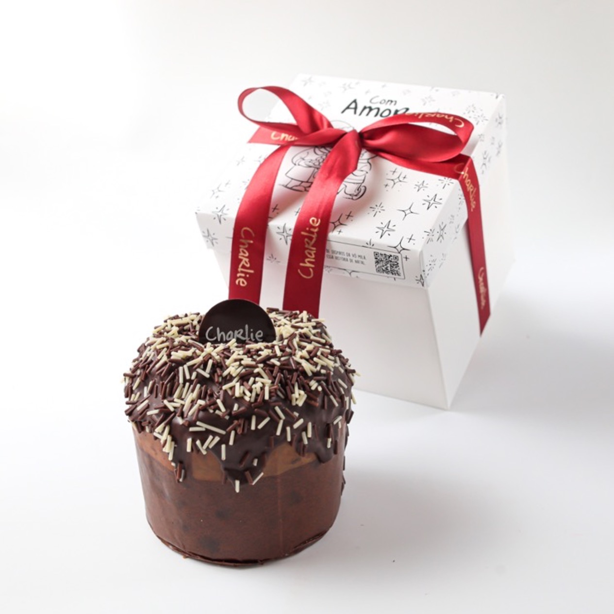 Elaborado com massa de brownie especialmente assado para versão chocotone e recheado com brigadeiro misto branco e preto