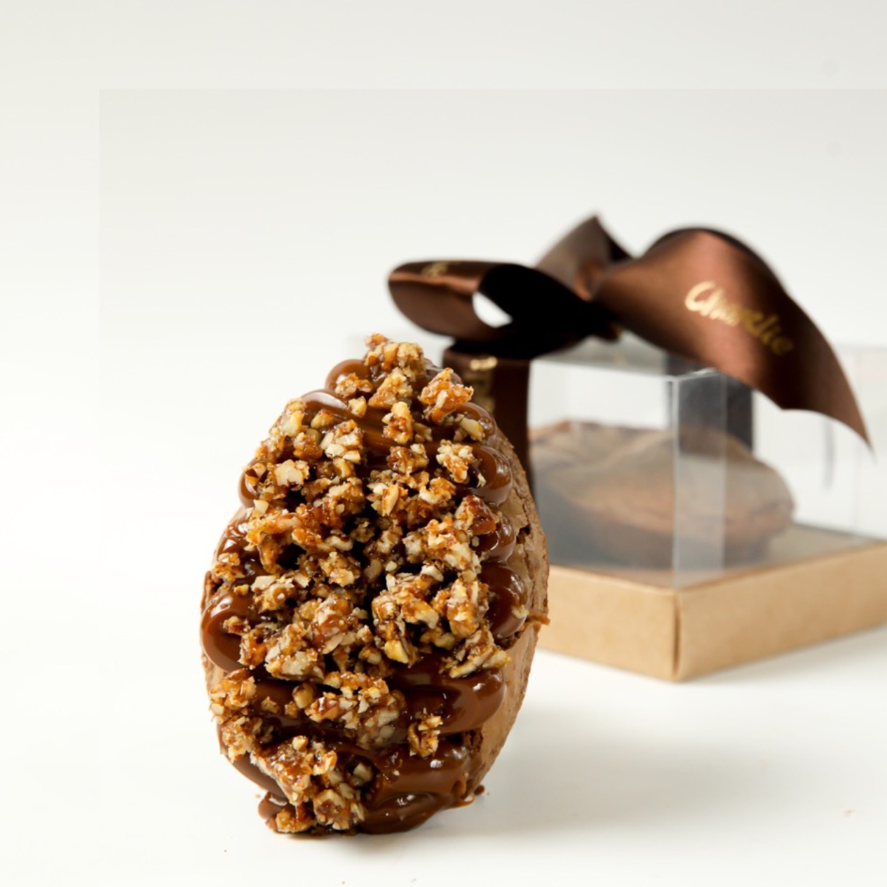 Meio ovo de brownie com cobertura de doce de leite e nozes crocantes na embalagem kraft