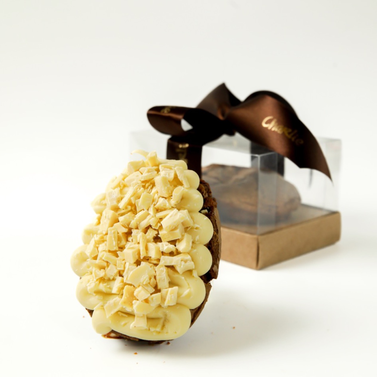 Meio ovo de brownie com cobertura de ganache de chocolate branco e Laka na embalagem kraft (200g)