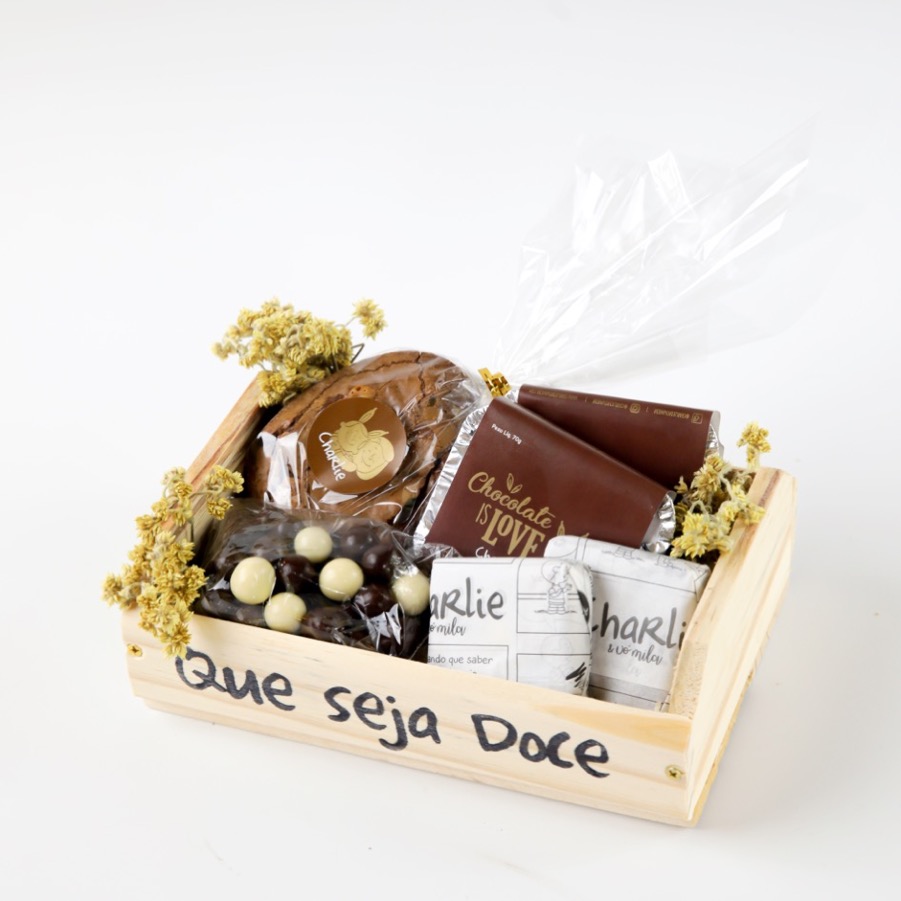 Caixote pequeno decorado com: - 02 Marmitas de Nutella® - 02 brownies clássicos - 01 ovinho de brownie (120g) - 01 pacote de drágeas de chocolate